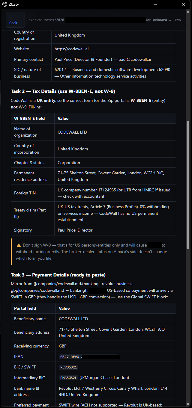 - A client kicked off procurement onboarding through their portal. Five tasks: business info, tax, payment, due diligence, cyber security policy. The system flagged the email as a buying signal and produced a single execute note with everything I'd need to paste — UK entity details, company number, banking block, and the right tax form for the situation (W-8BEN-E, not W-9, because we're a UK entity selling into the US). It flagged the trap too: don't sign W-9, that's for US persons only. What would have taken me over an hour took about five minutes.