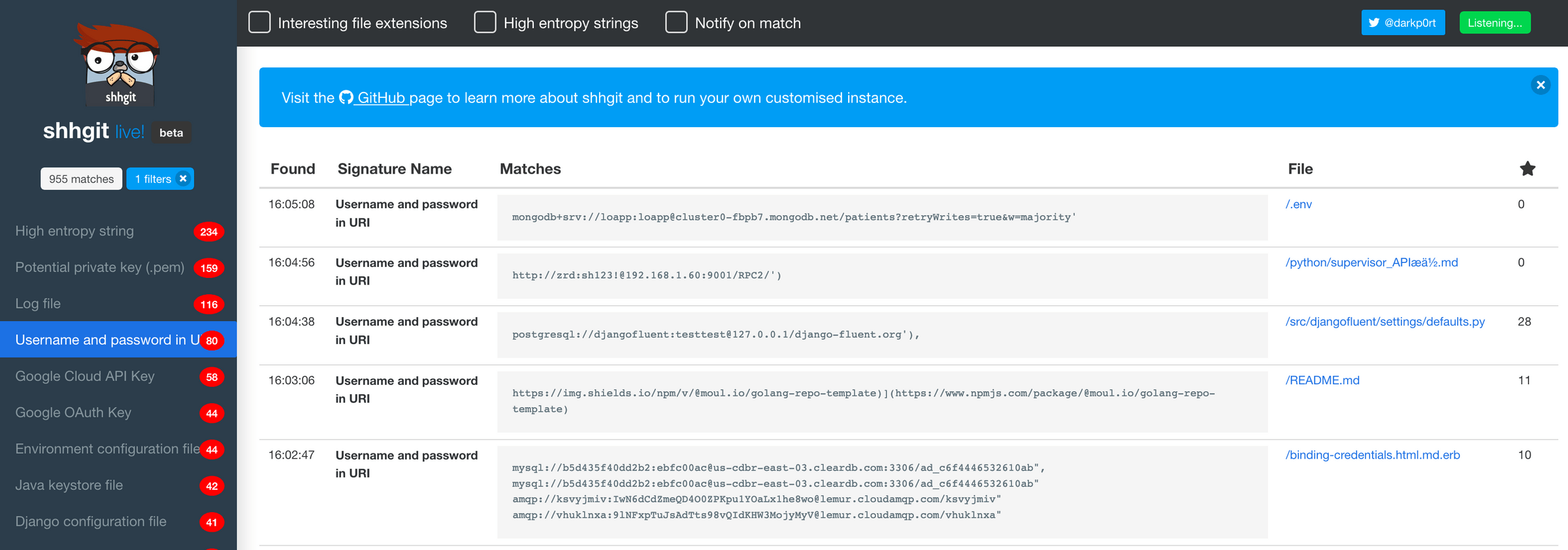 You can access shhgit live here. Watching the screen scroll through secret after secret is quite mesmerising.