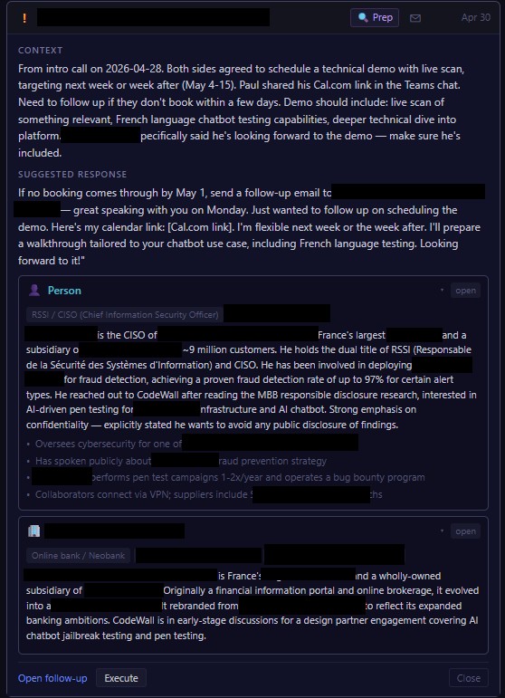 - A CISO at a digital bank booked a cold-call after reading our research pieces. Minutes after the call ended, the system had processed the Teams transcript, built him and his bank wiki pages from public material, and pulled the demo scope he'd asked for (live scan, French-language chatbot testing). Todos created for what I'd committed to. A follow-up email drafted referencing specifics from the call — pre-staged to send if no booking lands by May 1. If he books, the note updates. If May 1 passes silently, the draft surfaces to the top of my list, already waiting.