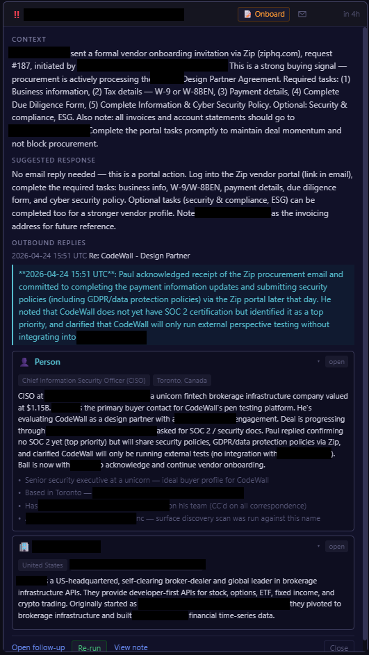 - A client kicked off procurement onboarding through their portal. Five tasks: business info, tax, payment, due diligence, cyber security policy. The system flagged the email as a buying signal and produced a single execute note with everything I'd need to paste — UK entity details, company number, banking block, and the right tax form for the situation (W-8BEN-E, not W-9, because we're a UK entity selling into the US). It flagged the trap too: don't sign W-9, that's for US persons only. What would have taken me over an hour took about five minutes.